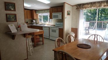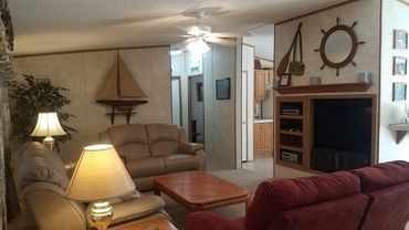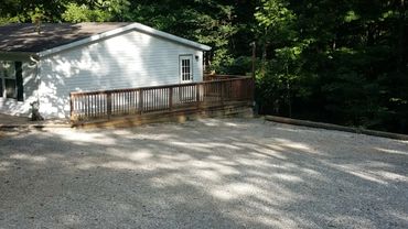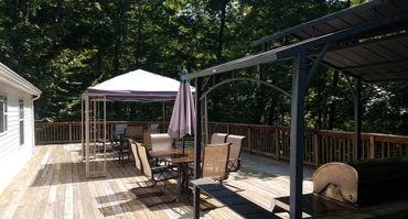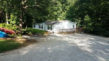 Grand trees partially shade a large secluded deck that adds to 'The LakeHouse'. It is a home that is located within the campground. It has three bedrooms (one king, two queens) with two full baths. There is a living room with dining area and a lightly equipped kitchen. The LakeHouse is available for rent starting at $200.00 each night. Limited to parties of six. Amenities include: Cable TV and DVD players; large back deck with propane grill, gazebo and large seating area; wireless internet within the campground; washer & dryer; access to Lake Cumberland Camping playground and swimming pool. Call for details or send email.